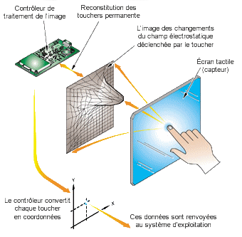 Cette couche conductrice est parcourue en continu par un courant électrique d’une certaine intensité. Au contact du doigt, ou d’un autre pointeur conducteur, une partie de ce courant est tout simplement transférée au doigt ou pointeur de l’utilisateur.