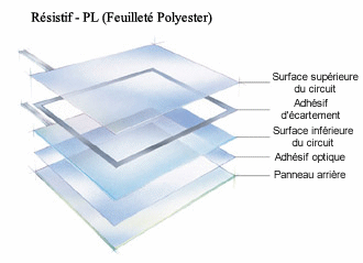 Un écran résistif est composé de deux couches conductrices séparées par une couche d’isolant. La couche supérieure en film de polyester, du côté de l’utilisateur, est flexible. La couche inférieure est en verre. Ces membranes sont conductrices par l’ajout d’une couche d’oxyde métallique. Ces deux couches sont tenus distantes par de microscopiques cales d’espacement.