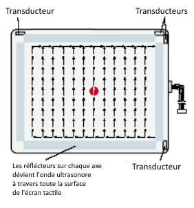 C’est un écran conçu par Elotouch dont le fonctionnement pourrait se rapprocher des écrans infrarouges. Ces technologies sont constituées d’une couche LCD (côté intérieur), d’une zone d’air, couverte par une couche de verre (côté extérieur). Dans ce cas, un transducteur émetteur va créer un signal ultrasonore qui sera redirigé partout sur l’écran grâce à des réflecteurs avant d’être renvoyé vers le transducteur récepteur qui convertit ce signal en carte numérique de l’écran. Un contact avec le pointeur absorbe une grande partie de l’onde située à cet endroit. Donc la carte numérique créée va être comparée à la carte numérique connue afin de déceler les anomalies et d’en déterminer des coordonnées. Cette opération se fait indépendamment pour l’axe X et l’axe Y de l’écran. Et en fonction de la quantité du signal absorbée, un nouvel axe Z est calculé.