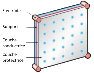 Le fonctionnement de cet écran repose sur une couche de métal rare conducteur située entre un support un verre (côté intérieur de l’écran) et une couche protectrice (côté extérieur, le plus souvent en verre).